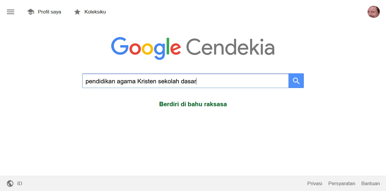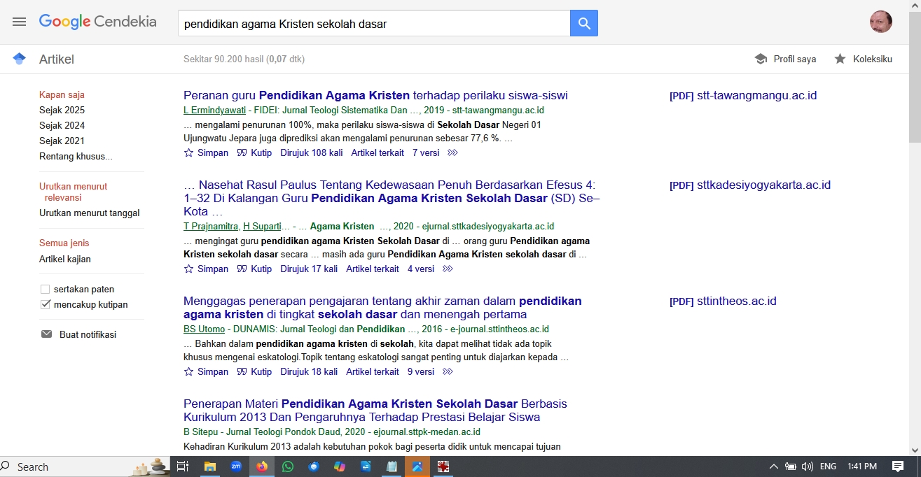 Ketiga, ketiklah beberapa kata kunci dalam kotak kosong tersebut. Misalnya, kalau mau cari sumber tentang pendidikan agama Kristen sekolah dasar, akan begini: